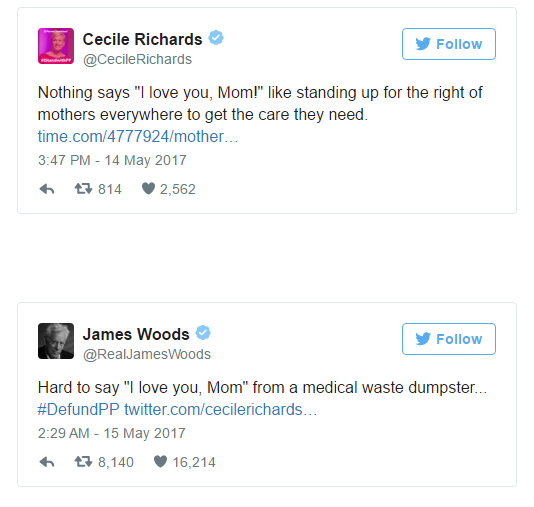 El actor James Woods contesta en un tweet a la CEO de la multinacional del aborto