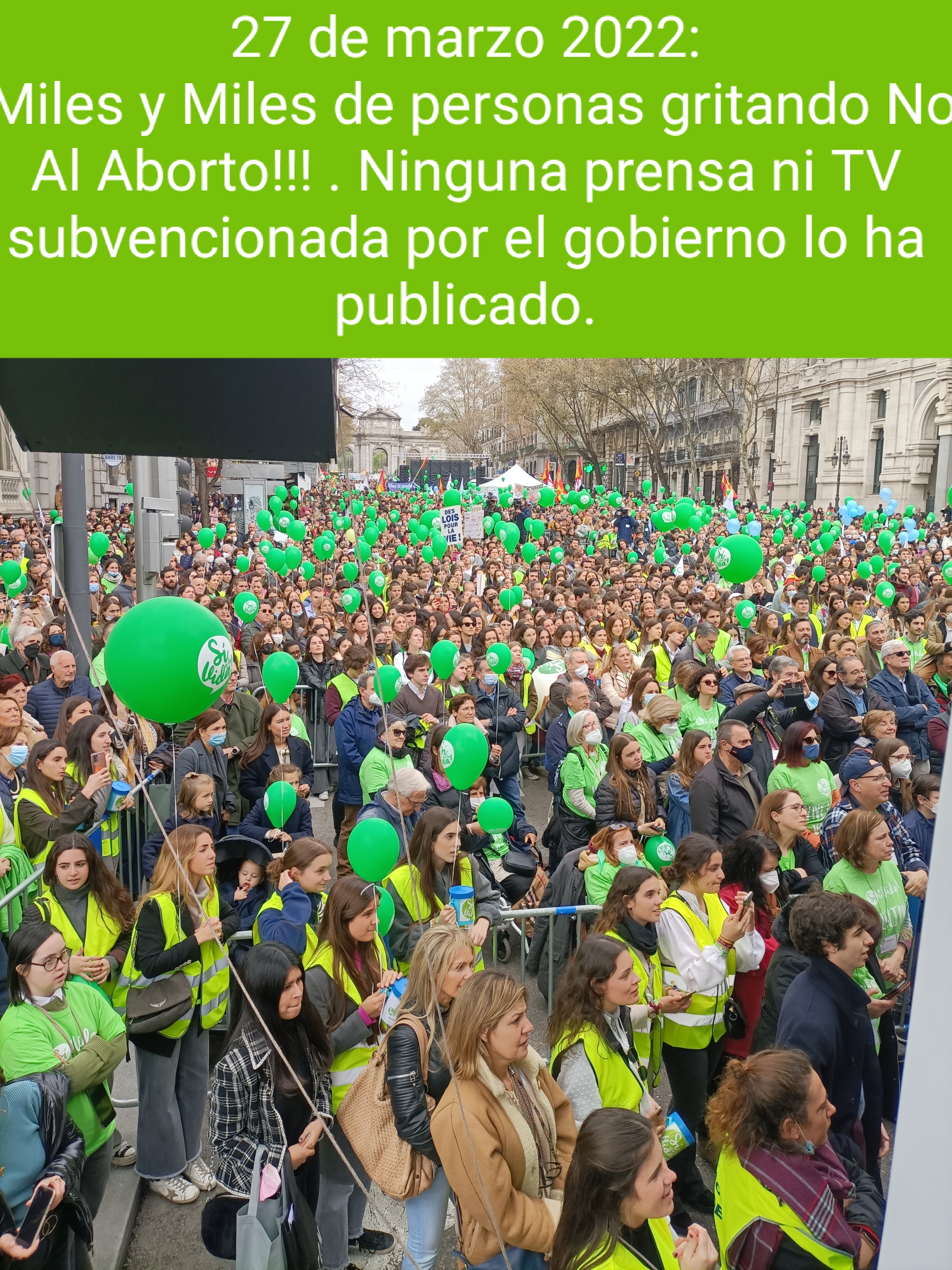 Marea de personas, sobre todo jóvenes, gritando NO AL ABORTO. La prensa y TV subvencionadas callan.